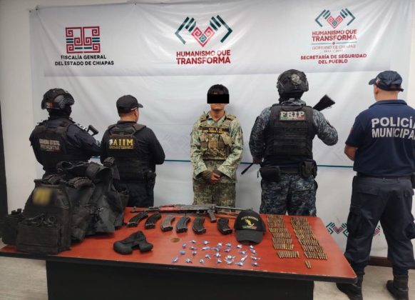 En operativo interinstitucional, la Secretaría de Seguridad del Pueblo (SSP) a través de la Fuerza de Reacción Inmediata Pakal (FRIP) y la Guardia Estatal Preventiva en coordinación con la Agencia de Investigación e Inteligencia Ministerial de la Fiscalía General del Estado (FGE), la Secretaría de Seguridad y Protección Ciudadana (SSPC) del Gobierno Federal, Guardia Nacional, Ejército Mexicano, Marina Armada de México y la Policía Municipal, detuvieron a un masculino por presunta portación de arma de fuego de uso exclusivo de las fuerzas armadas, en el municipio de Ocozocoautla de Espinosa.
