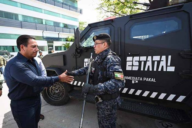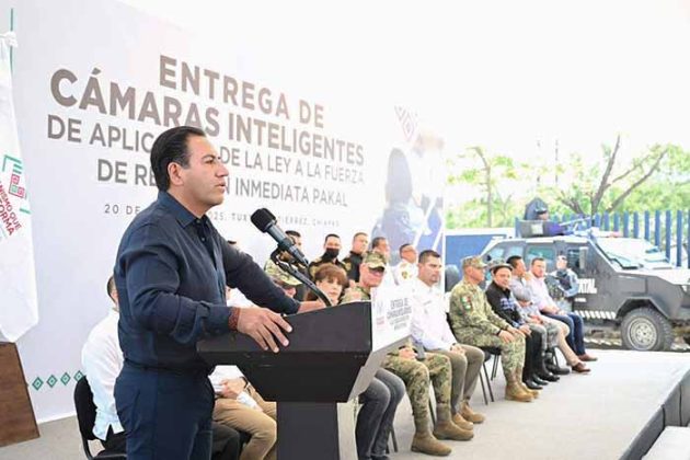 Durante la entrega de cámaras inteligentes y vehículos blindados a la Fuerza de Reacción Inmediata Pakal (FRIP), el gobernador Eduardo Ramírez Aguilar destacó que la seguridad es una de las principales prioridades del gobierno de la Nueva ERA, por lo que se ha realizado una importante inversión en equipamiento, unidades terrestres y aéreas, herramientas tecnológicas e inteligencia operativa, con el objetivo de contar con una policía preparada y altamente profesional al servicio del pueblo de Chiapas.