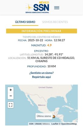 InicioAl InstanteInformación preliminar del Sismo Magnitud 4.9 localizado al Suroeste de Cd. Hidalgo...