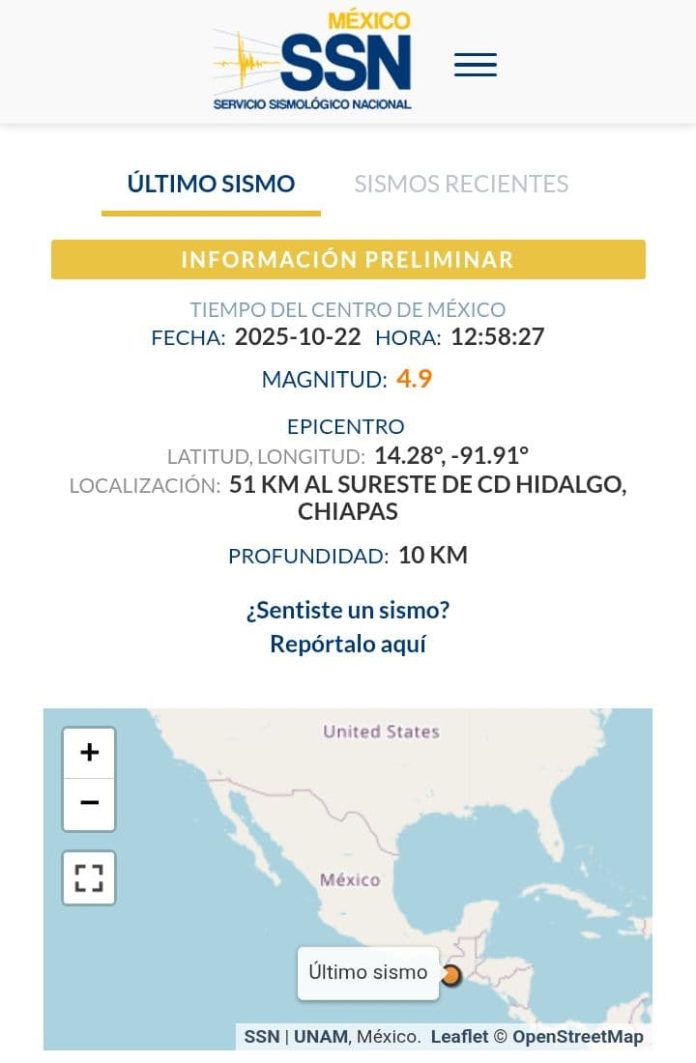 Información preliminar del Sismo Magnitud 4.9 localizado al Suroeste de Cd. Hidalgo Chiapas