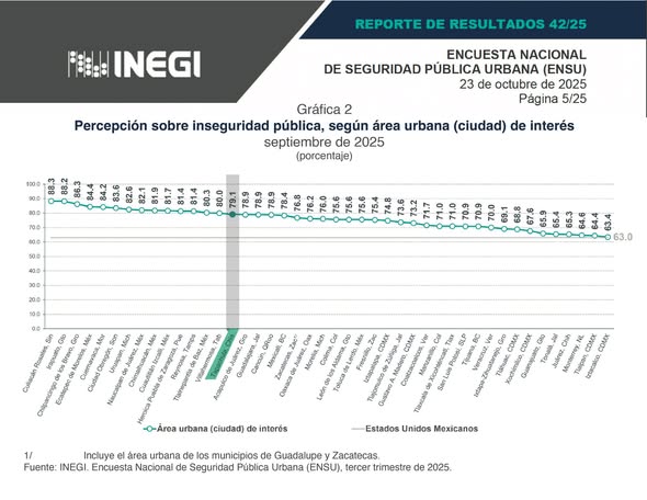 Me da mucho gusto amanecer con esta gran noticia: en La Perla del Soconusco, la percepción de inseguridad está disminuyendo. Según la encuesta del INEGI, Tapachula pasó de estar en los primeros lugares de percepción de inseguridad al lugar 15 en la encuesta sobre la inseguridad pública en septiembre de 2025. Esto es resultado del esfuerzo conjunto y la coordinación entre las autoridades y la sociedad. Quiero agradecer a las Fuerzas Armadas y a todas las instituciones de seguridad que día a día trabajan para garantizar la paz y la tranquilidad de las y los ciudadanos.