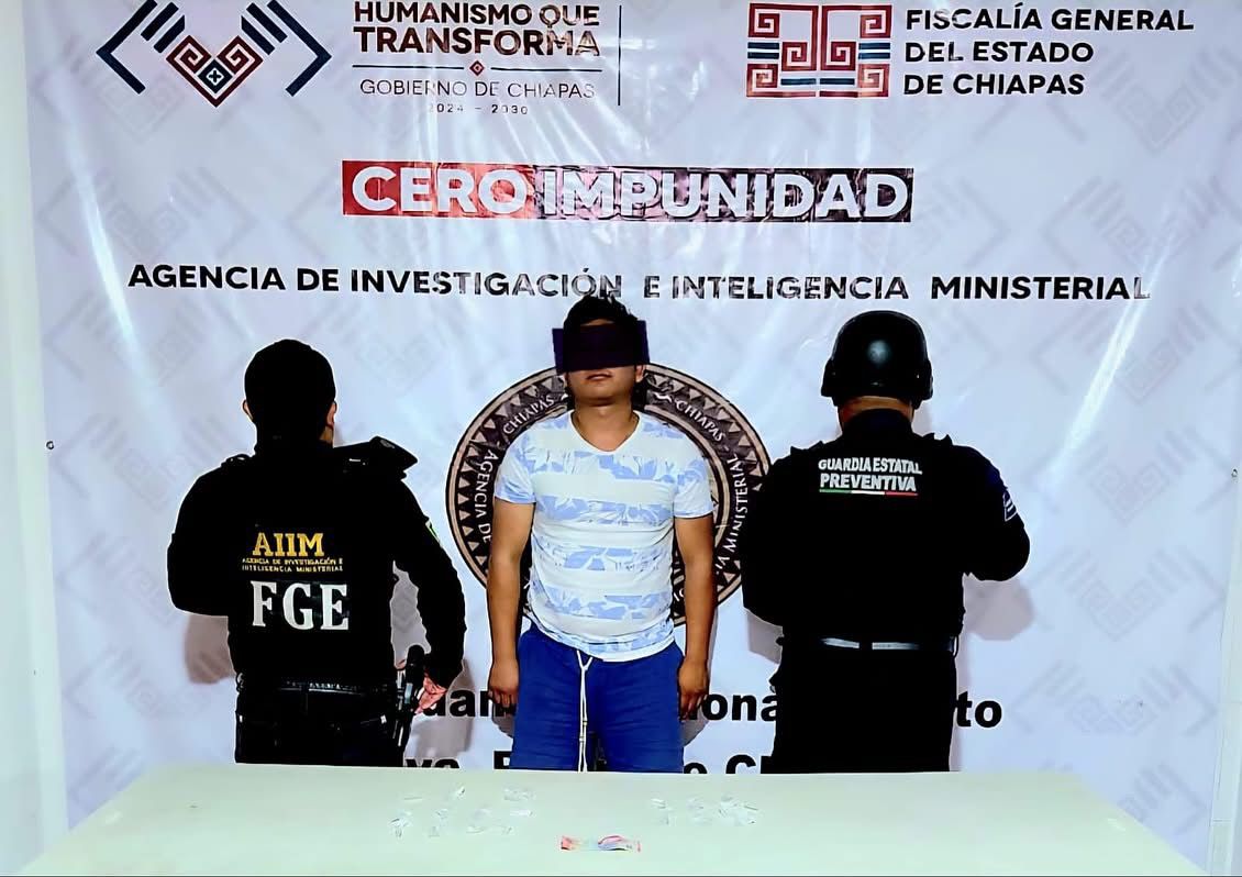 La Secretaría de Seguridad del Pueblo (SSP) a través de la Guardia Estatal Preventiva, en coordinación con la Agencia de Investigación e Inteligencia Ministerial (AIIM) de la Fiscalía General del Estado (FGE) y la Secretaría de Seguridad y Protección Ciudadana (SSPC) del Gobierno Federal, detuvieron a un masculino por el probable delito contra la salud en el municipio de Palenque.