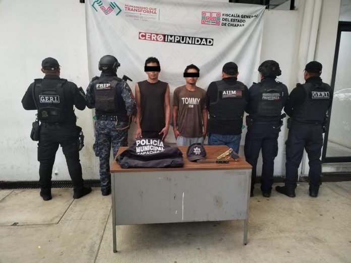 Tapachula, Chiapas.– Derivado de trabajos de inteligencia y vigilancia estratégica, la Secretaría de Seguridad Pública y Protección Ciudadana Municipal logró la detención de dos presuntos integrantes de una banda familiar dedicada al robo a casa habitación y comercios en distintos puntos de la ciudad.