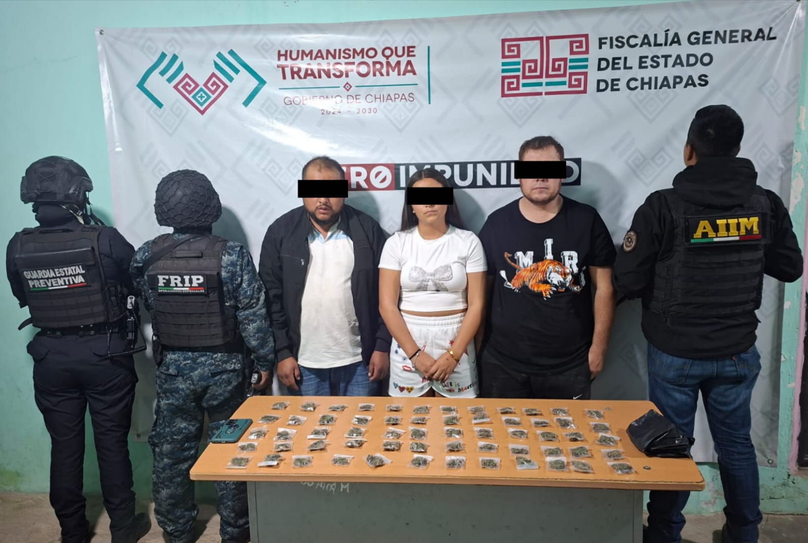 La Fiscalía General del Estado y la Secretaría de Seguridad del Pueblo detuvieron en flagrancia a Cinthia “N”, Artemio “N” y Claudio “N”, como presuntos responsables de los delitos contra la salud y robo de vehículo en su modalidad de traslado, cometido en agravio de quien o quienes resulten ofendidos, por hechos ocurridos en el barrio de Fátima, del municipio de San Cristóbal de Las Casas.