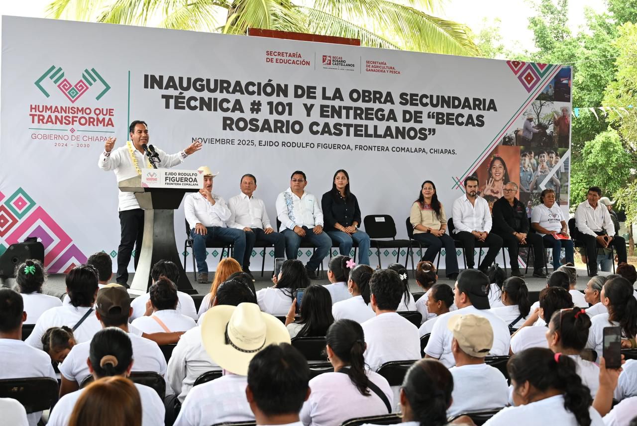 El gobernador Eduardo Ramírez Aguilar, acompañado de la directora de Alimentación para el Bienestar del Gobierno de México, María Luisa Albores González, realizó una gira de trabajo por el municipio de Frontera Comalapa, donde se anunció el Programa de Apoyo Complementario a la Comercialización del Maíz, una estrategia que busca garantizar un precio justo para las y los productores de este grano básico.