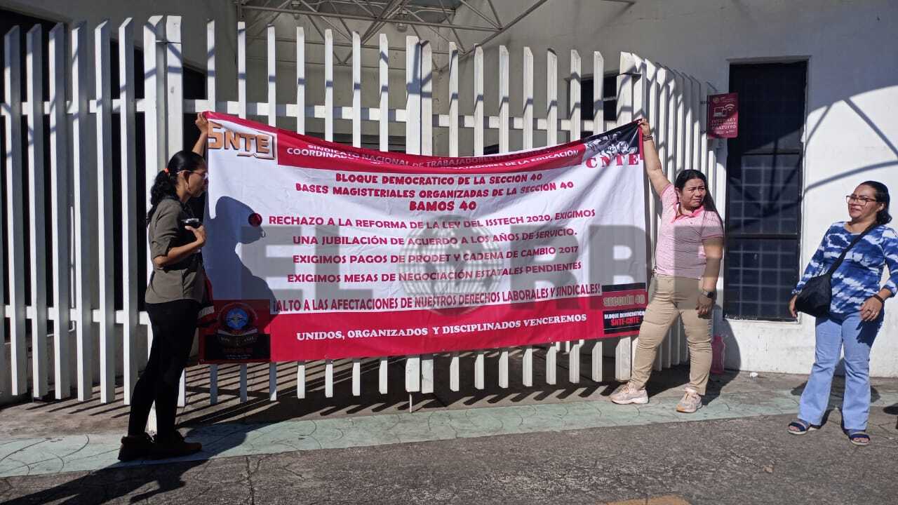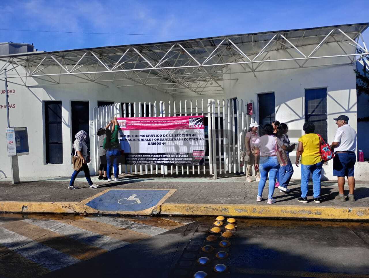 Tapachula 13 de noviembre 2025._ Un grupo de 50 maestros de la sección 40 del Sindicato Nacional de Trabajadores de la Educación, SNTE inician una protesta en la clinica-hospital del ISSTECH ubicado en la tercera avenida sur prolongación 38. Los naranjos de esta ciudad.