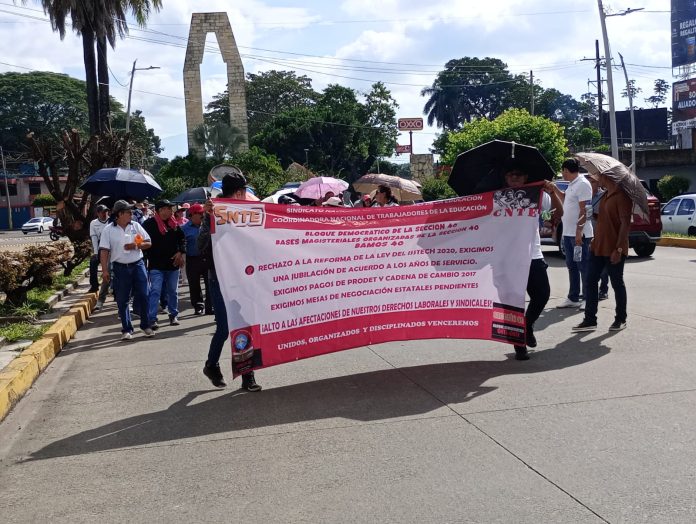 El magisterio de la sección 40 del Sindicato Nacional de Trabajadores de la Educación SNTE. Marchan partiendo de la glorieta de bonanza para culminar con un mitin en la explanada del parque central Miguel Hidalgo.