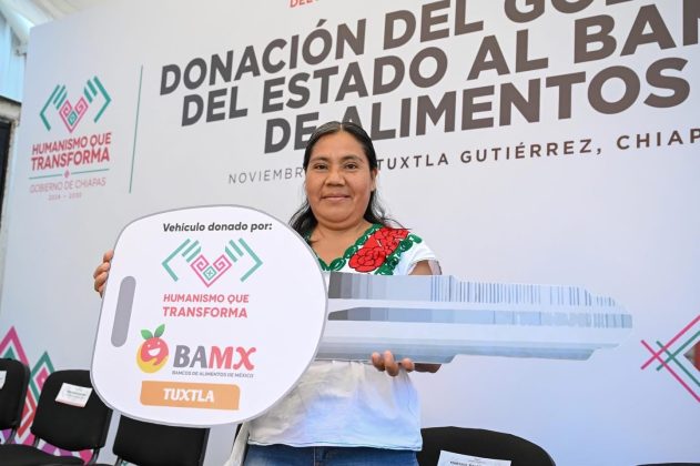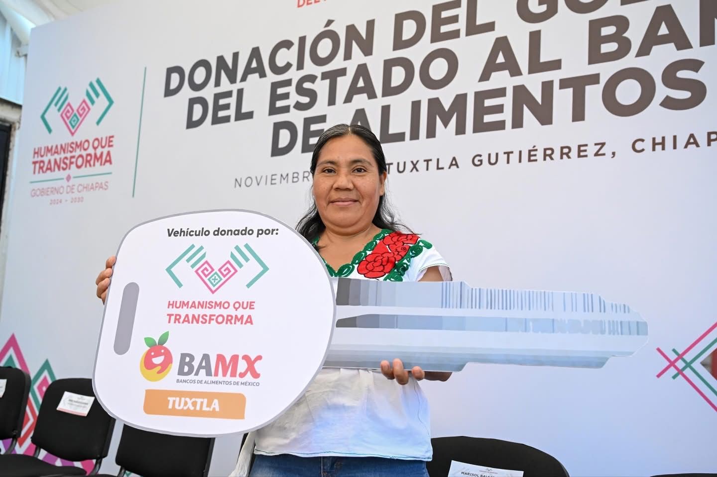 El gobernador Eduardo Ramírez Aguilar encabezó el acto de donación de un vehículo de carga al Banco de Alimentos de México A.C. (BAMX) en Tuxtla Gutiérrez, donde reafirmó su respaldo a los organismos y asociaciones civiles que trabajan con amor y humanismo para apoyar a la población, especialmente a quienes se encuentran en situación de mayor vulnerabilidad.