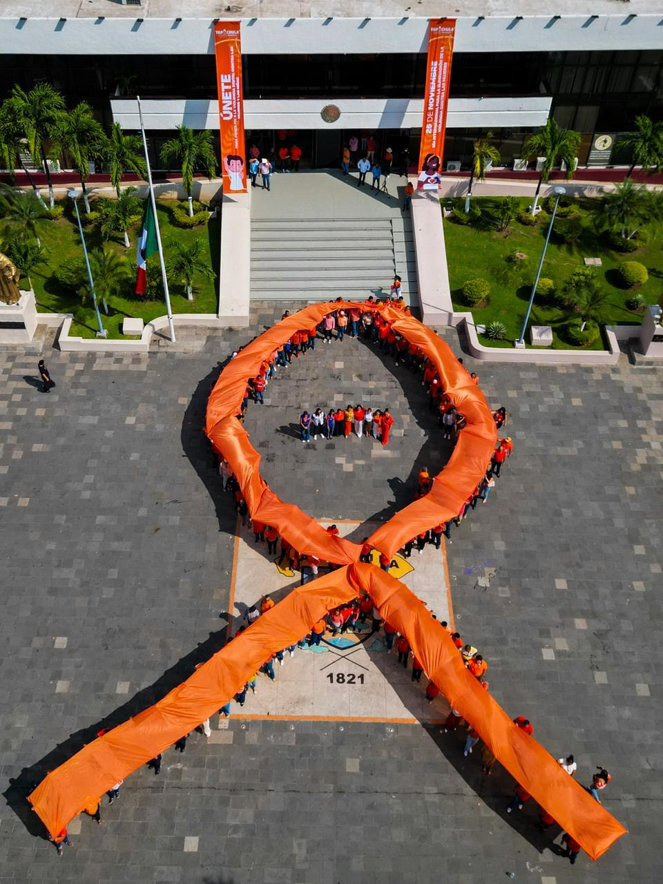 Al encabezar la formación del Moño Naranja, la secretaria de Igualdad de Género Municipal, Yolanda Hernández de León, en representación del presidente municipal, destacó que la formación del lazo no sólo es un emblema gráfico sino que simboliza el trabajo coordinado para fortalecer los mecanismos de apoyo, promover la denuncia y consolidar una cultura de respeto y protección de los derechos de las mujeres y niñas, en el conocido también como Día Naranja.