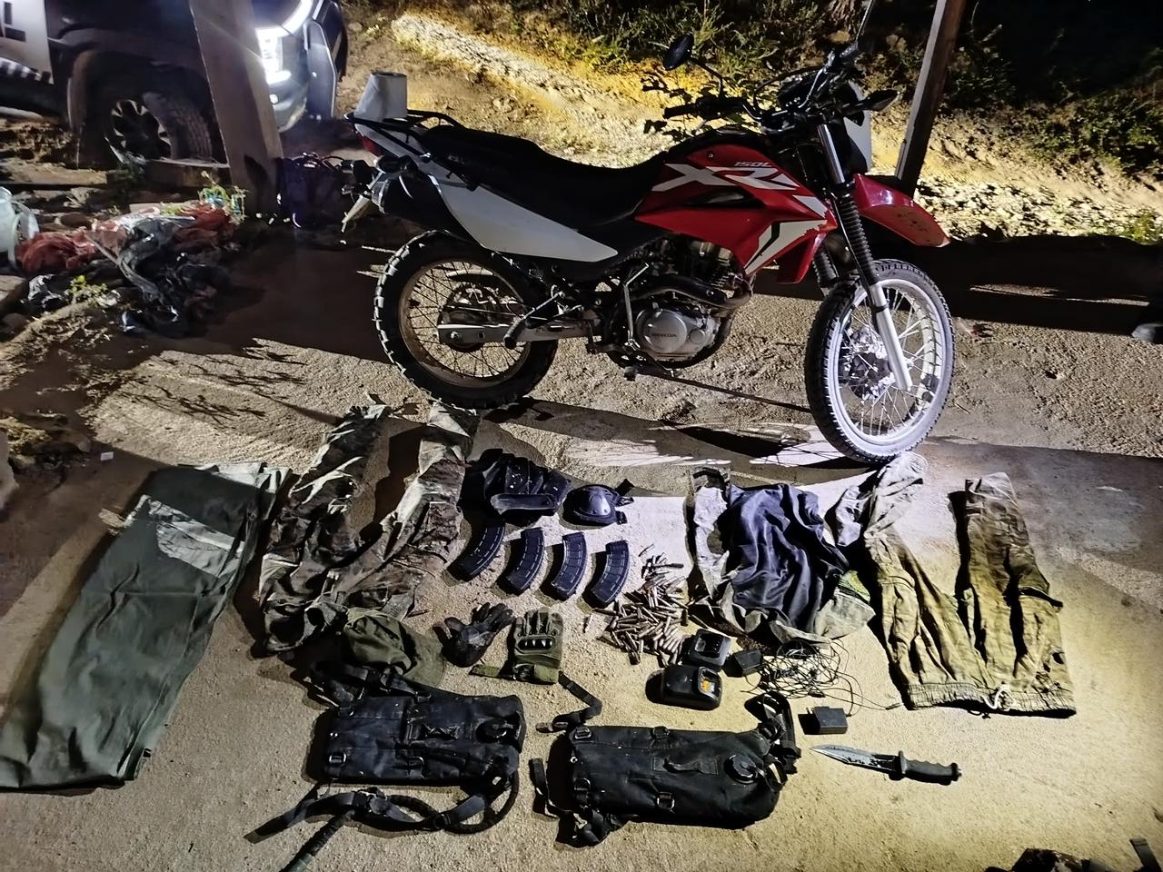 En esta última acción, dijo Llaven Abarca, se localizó también una motocicleta abandonada junto con ropa táctica, cuchillos y cargadores pertenecientes a las personas que agredieron a la población, quienes huyeron a través de las montañas.