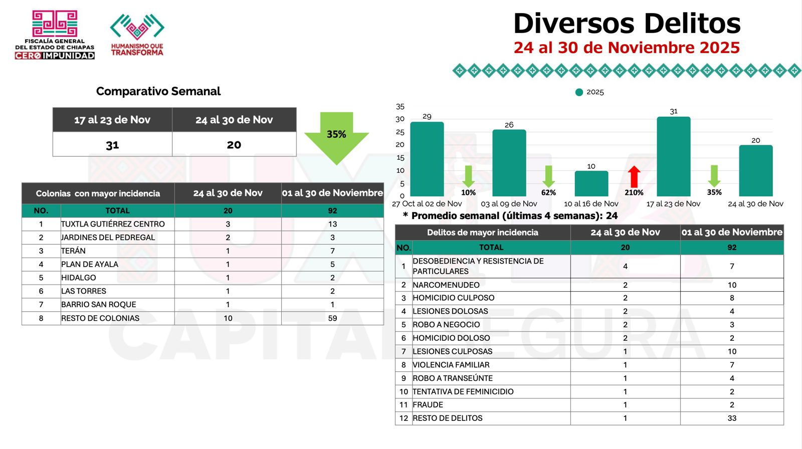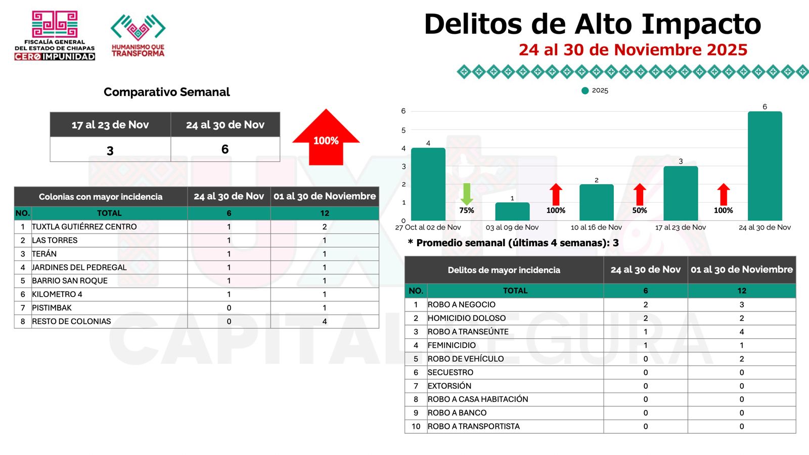 • En la semana del 24 al 30 de noviembre en Tuxtla Gutiérrez, la incidencia general disminuyó un 35 %, mientras que la incidencia de alto impacto aumentó el 100 %