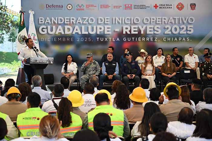 En Tuxtla Gutiérrez, el gobernador Eduardo Ramírez Aguilar dio el banderazo de inicio del Operativo Guadalupe-Reyes 2025. Señaló que el propósito es reforzar la coordinación entre las autoridades de seguridad y procuración de justicia, las Fuerzas Armadas, el sector salud, así como las instituciones estatales y municipales, con el fin de garantizar la tranquilidad y el bienestar de la población ante el incremento de la movilidad y las celebraciones decembrinas.