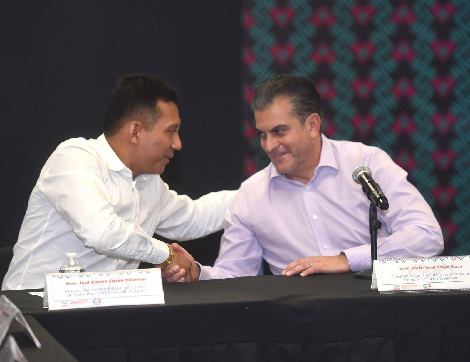 TAPACHULA, CHIAPAS – 2 DE DICIEMBRE DE 2025.- El presidente Yamil Melgar recibió de manos del Maestro Pepe Llaven, director general del Centro Estatal de Control de Confianza Certificado del Estado de Chiapas (C3), la certificación y los resultados de la evaluación de los elementos de la Policía Municipal de Tapachula. Es importante destacar que Tapachula es uno de los municipios que ha cumplido al 100% con este relevante proceso.
