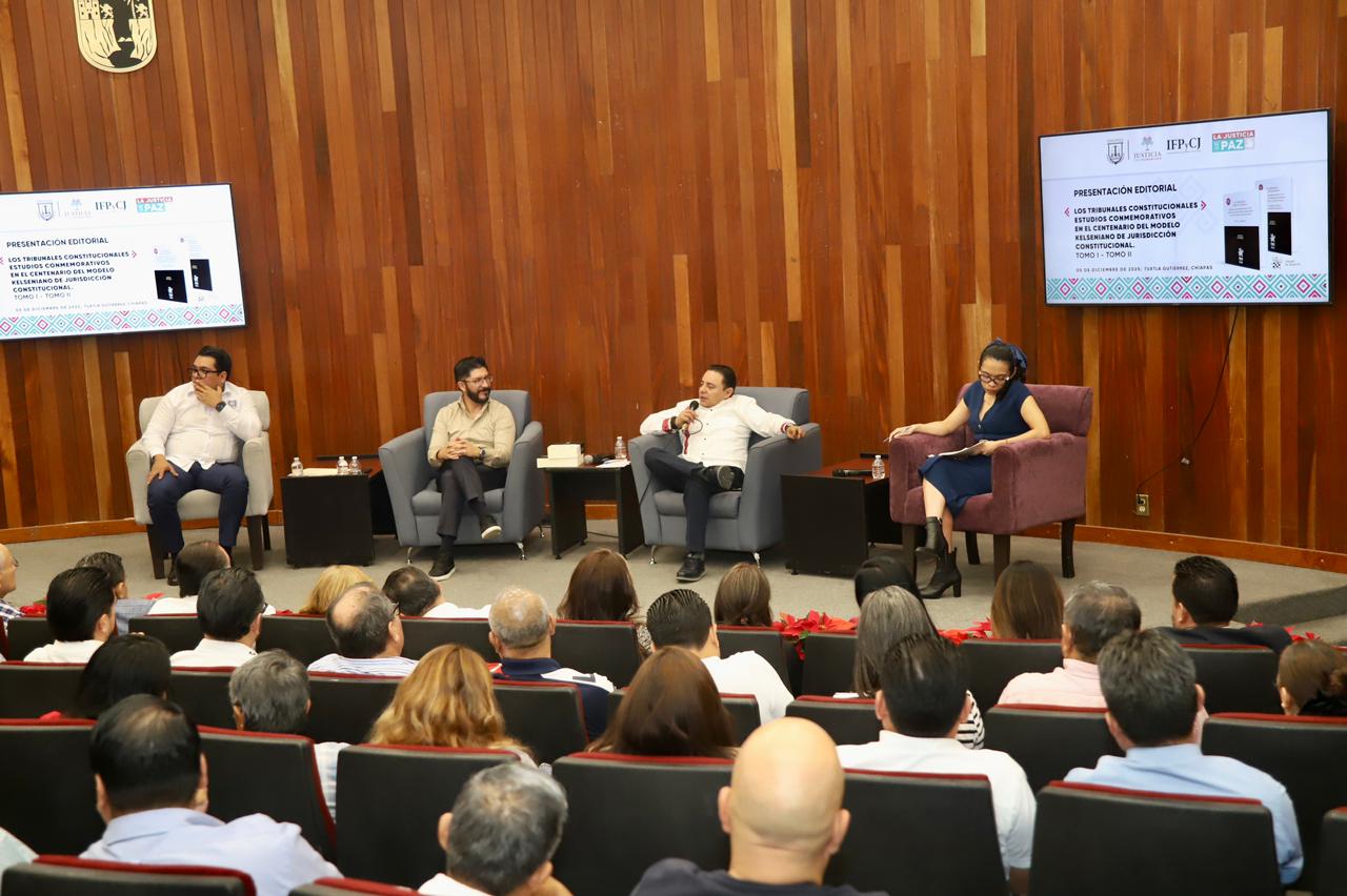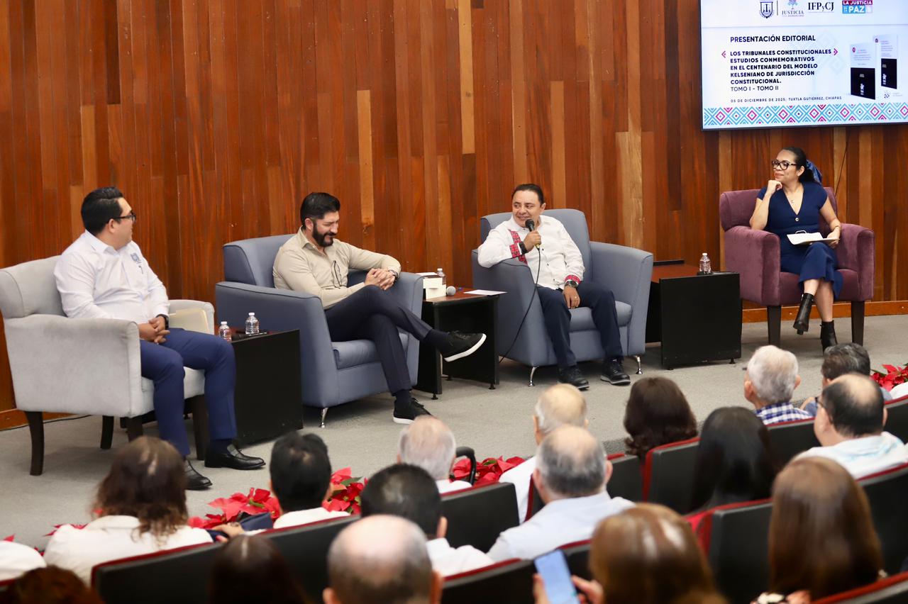 Con el propósito de fortalecer la reflexión académica y la comprensión de la justicia constitucional, el Poder Judicial del Estado de Chiapas realizó la Presentación Editorial “Los Tribunales Constitucionales. Estudios conmemorativos en el centenario del modelo kelseniano de jurisdicción constitucional, Tomo I y Tomo II”, en el Auditorio Don Enrique Robles Domínguez en la sede judicial Tuxtla.