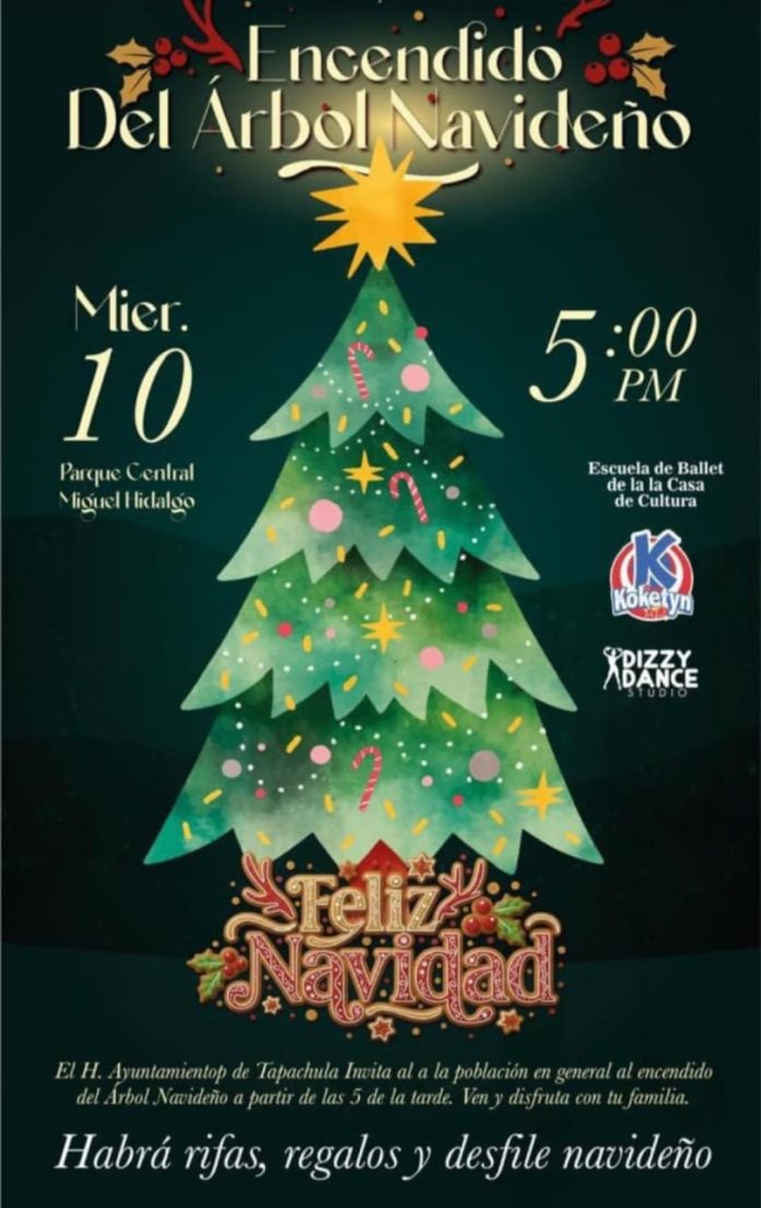 Nos vemos mañana en el Parque Central Miguel Hidalgo de nuestro querido Tapachula, en punto de las 5:00 de la tarde, para vivir juntos el encendido del árbol y dar inicio a la magia de la Navidad. Que la luz, la esperanza y la unión iluminen nuestros corazones. ¡Ánimo! ✨🎄