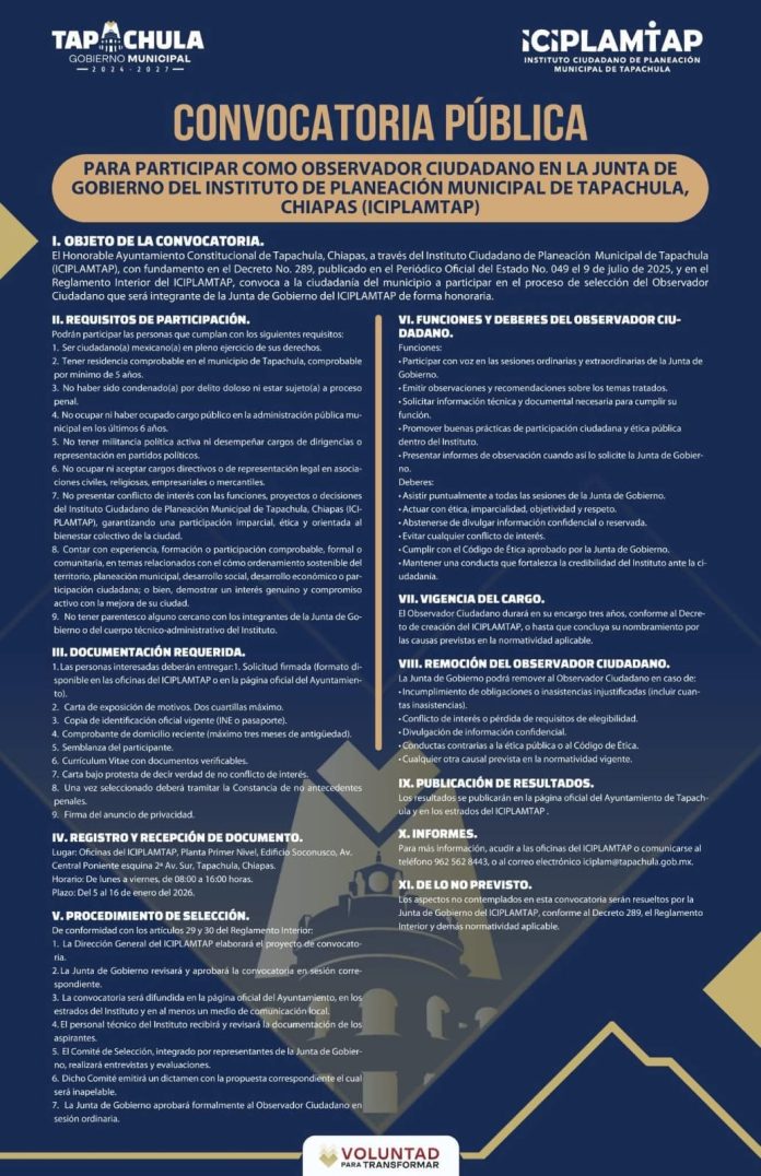 El Ayuntamiento de Tapachula te invita a formar parte activa de las decisiones que dan rumbo a nuestra ciudad, participando en la Convocatoria para integrar al Observador Ciudadano de la Junta de Gobierno del Instituto Ciudadano de Planeación Municipal de Tapachula (ICIPLAMTAP).