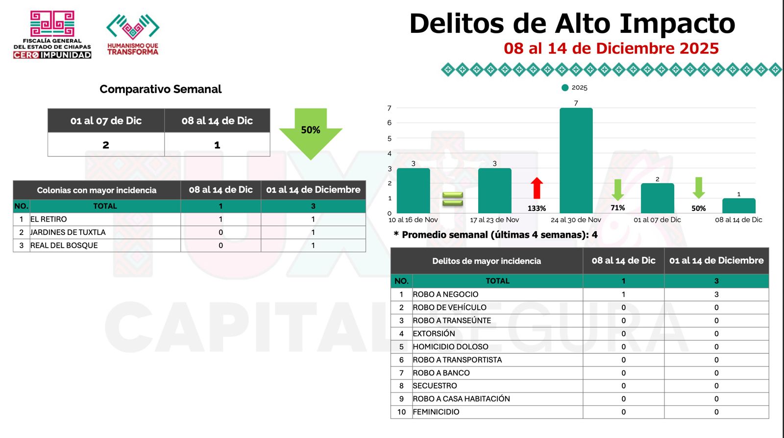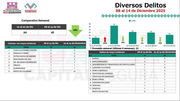 Llaven Abarca también dio a conocer la estadística delictiva en Tuxtla Gutiérrez, correspondiente del 8 al 14 de diciembre. Explicó que en cuanto a delitos diversos se registró un descenso del 20 por ciento, en comparación con la primera semana de diciembre, donde se iniciaron 20 carpetas de investigación, mientras que en la semana se radicaron 16.