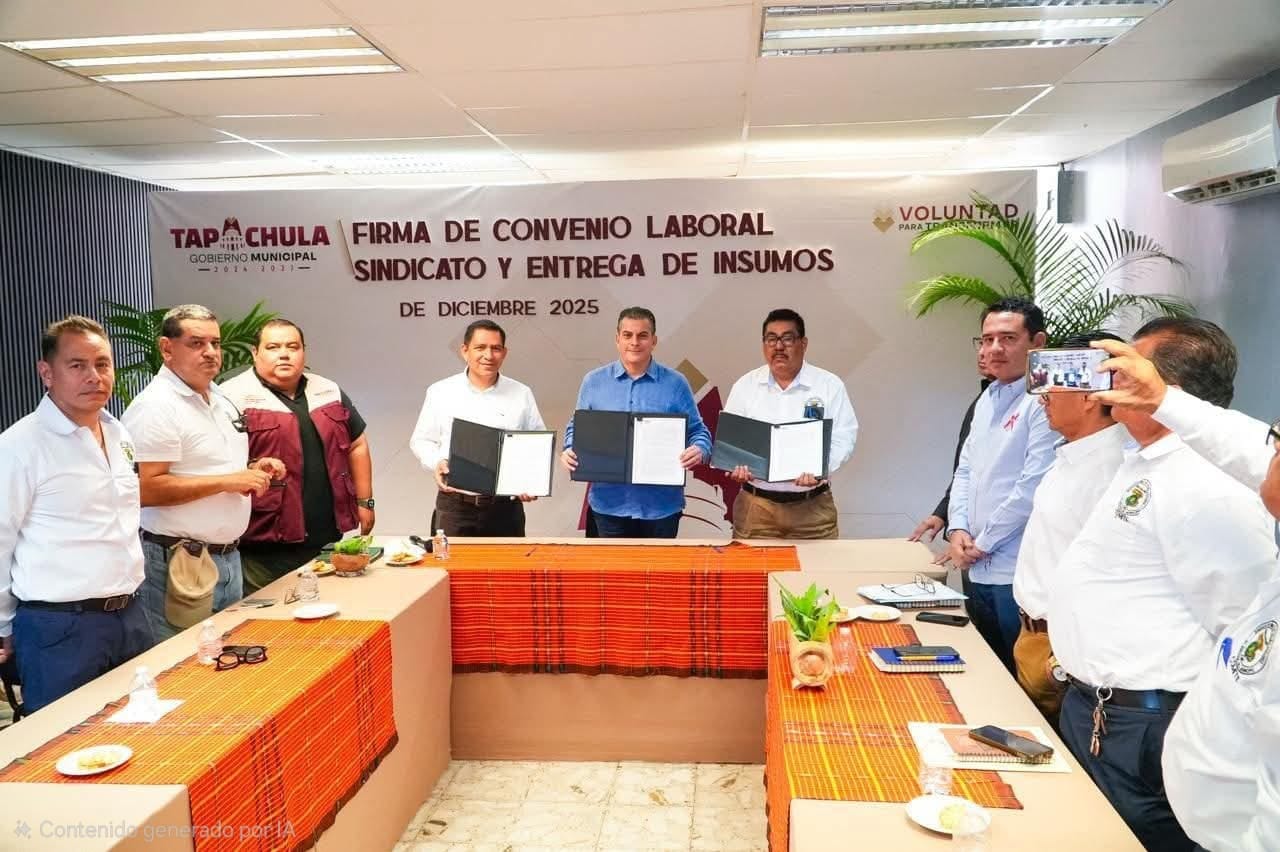 26, Diciembre del 2025.- Tapachula, Chiapas.— El presidente municipal, Yamil Melgar, encabezó la firma del convenio laboral con el Sindicato Único de Trabajadores al Servicio del Municipio, en un marco de diálogo, respeto y comunicación constante.