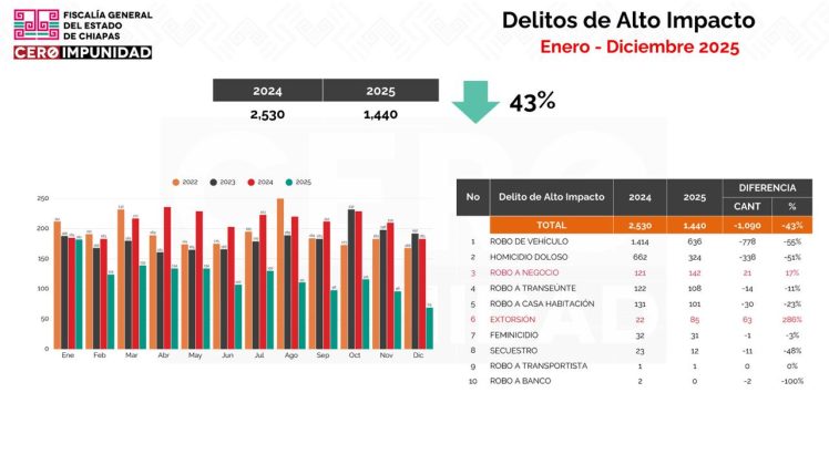 En la transmisión en vivo, Jorge Llaven dio a conocer la incidencia delictiva estatal, donde mencionó que durante el 2025 Chiapas registró un descenso general del 43 por ciento en delitos de alto impacto y para dimensionar el resultado dijo que en 2024 se iniciaron 2 mil 530 carpetas de investigación por delitos de alto impacto, mientras que en 2025 se abrieron mil 440.