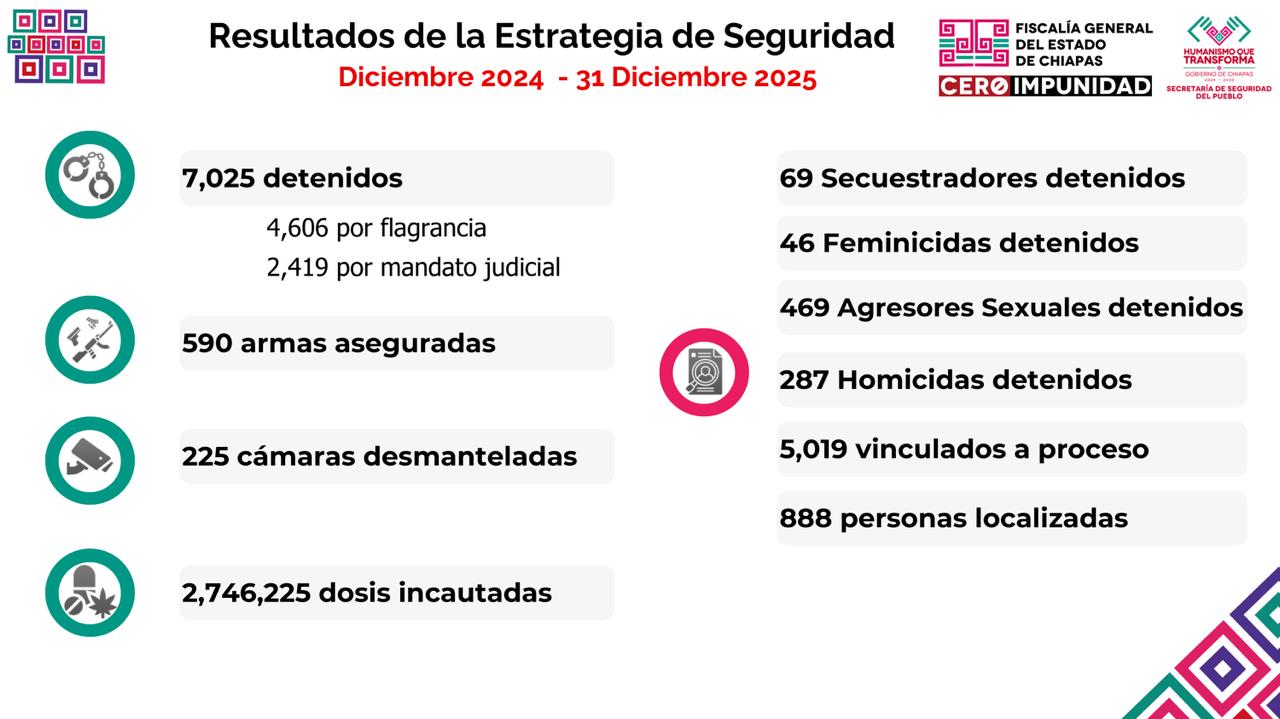 Dio a conocer que al cierre de 2025 se detuvieron a 7 mil 25 personas, de las cuales 4 mil 606 fueron por flagrancia y 2 mil 419 por mandato judicial. Asimismo, se aseguraron cerca de 600 armas de fuego, se desmantelaron 225 cámaras parásitas utilizadas por la delincuencia organizada y se incautaron más de dos millones y medio de dosis de diversas drogas. Además, se logró la detención de 69 secuestradores, 46 feminicidas, 469 agresores sexuales y 287 homicidas; 5 mil 19 personas fueron vinculadas a proceso y 888 personas localizadas durante el año.