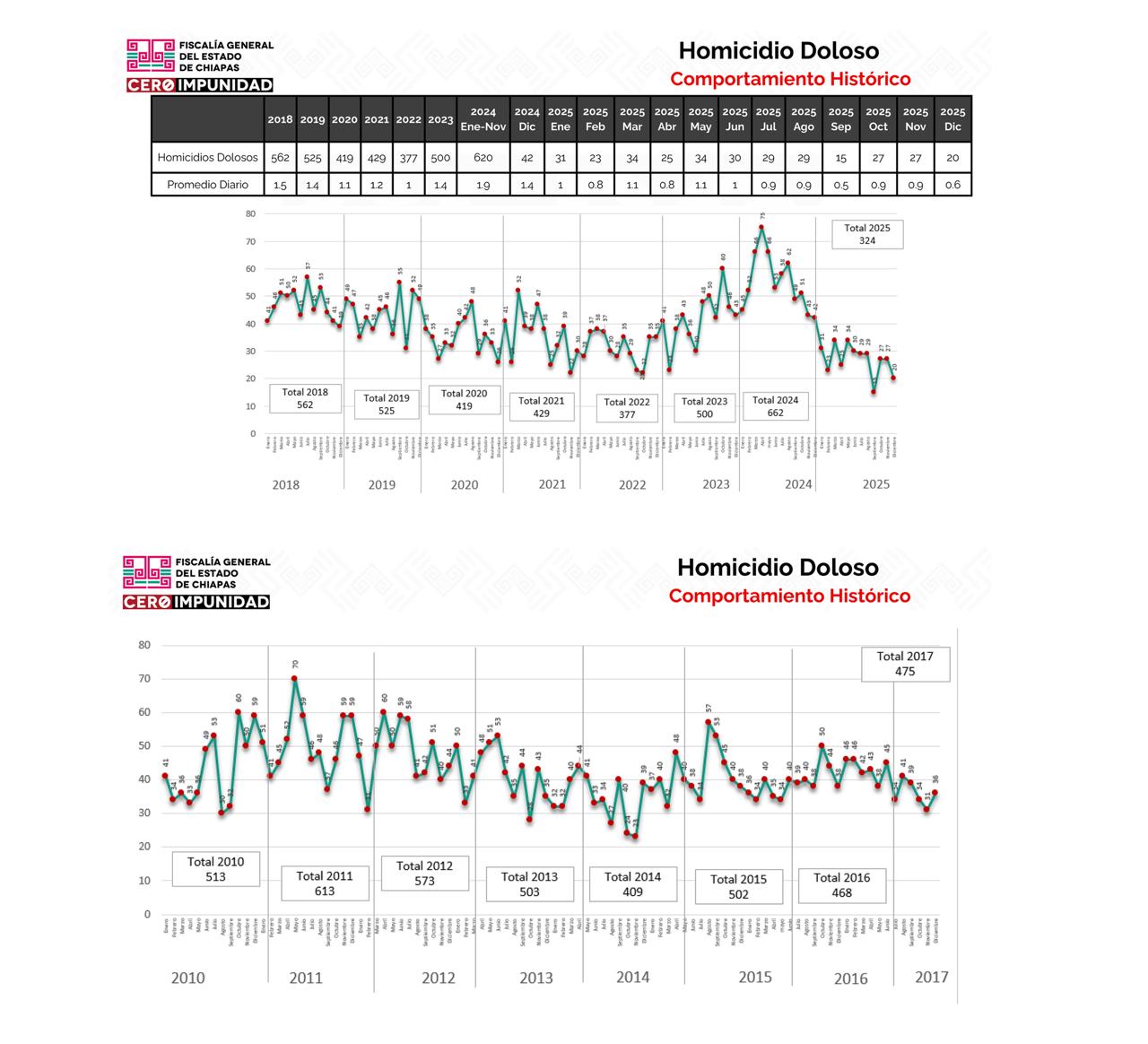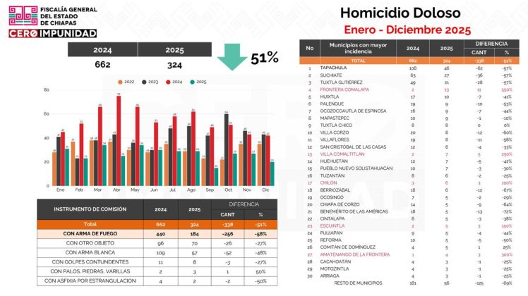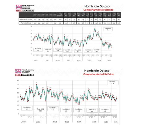 Al comparar el comportamiento del homicidio doloso desde el año 2010 a la fecha, refirió que el año que concluyó registró la cifra más baja de los últimos 15 años, lo que confirma que las estrategias de seguridad y justicia están dando resultados en Chiapas. Recordó que en 2024 se alcanzó el registro más alto con 662 homicidios dolosos; sin embargo, en 2025 la cifra se redujo a 324.
