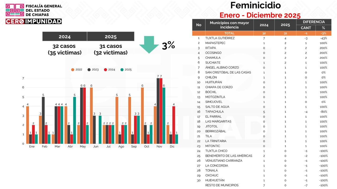 Mientras que en delitos de alto impacto, la capital chiapaneca resaltó la disminución del homicidio doloso registrando un descenso del 57 por ciento, al pasar de 49 en 2024 a 21 en 2025. Respecto al delito de feminicidio, mencionó que en 2024 se registraron siete casos, mientras que en 2025 se cerró con cuatro feminicidios, lo que representa una reducción del 43 por ciento; en robo de vehículo se reportó una reducción del 13 por ciento.