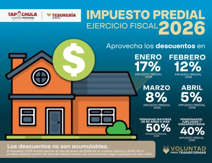 El Ayuntamiento de Tapachula a través de la Tesorería Municipal, informa a la población que los pagos del impuesto predial, ejercicio fiscal 2026, podrán realizarse a partir del próximo lunes 13 de enero.