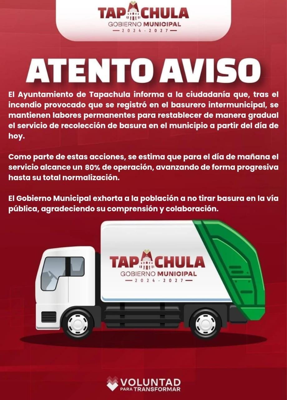 El Ayuntamiento de Tapachula informa a la ciudadanía que el servicio de recolección de basura se restablecerá de forma gradual a partir de hoy. El gobierno municipal exhorta a la población a no tirar basura en la vía pública.