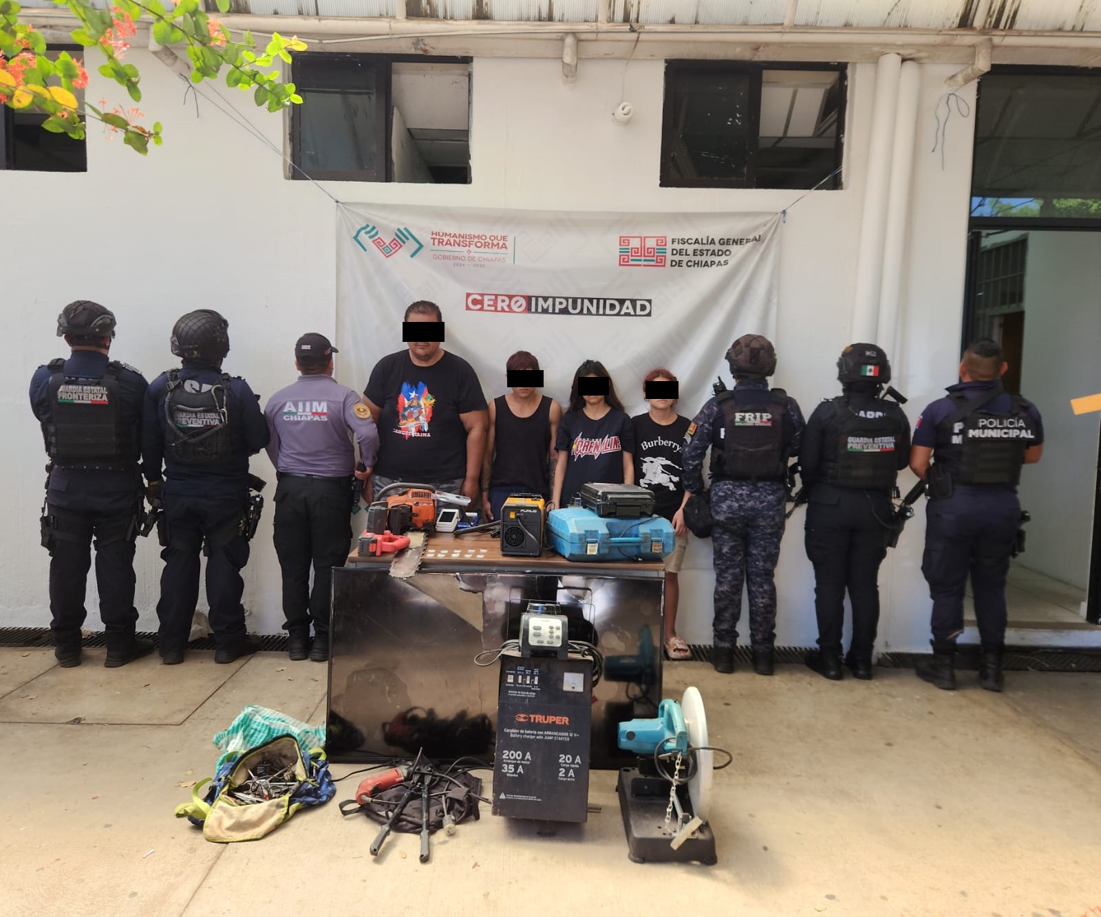 María “N”, Yohandri “N”, Marisol “N” y Carlos “N”, fueron arrestados luego de recibir el reporte de robo suscitado en un su taller mecánico ubicado en dicho municipio. A los señalados les aseguraron 10 bolsitas con material sólido cristalino con las características del cristal, cortadora Makita, máquina de carga para motocicleta Truper, máquina para soldar, una motosierra, bolsa con herramientas, Sizaya, motosierra pequeña, taladro eléctrico, motores de licuadoras, waflera, planta de soldadura y terminales de un banco.