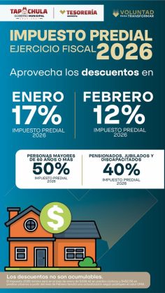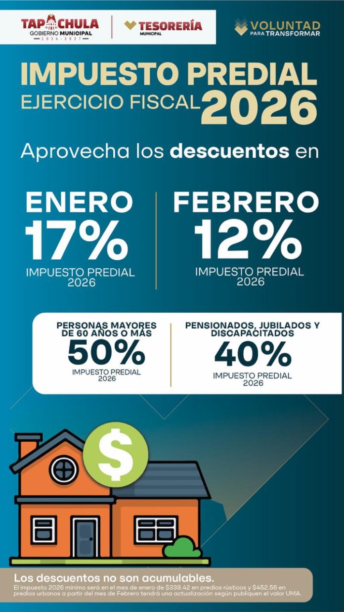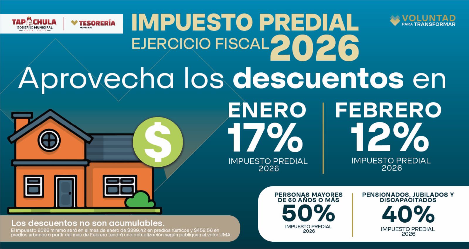 El Ayuntamiento de Tapachula a través de la Tesorería Municipal, invita a la ciudadanía a cumplir en tiempo con el pago del impuesto predial ejercicio fiscal 2026, y aprovechar los descuentos vigentes durante los primeros meses del año.