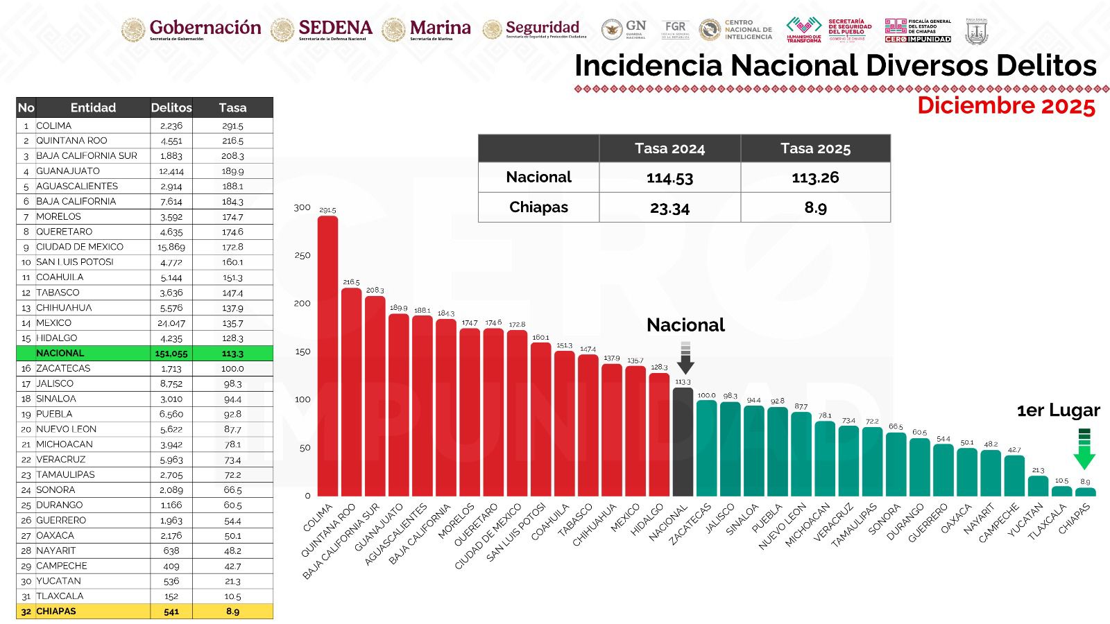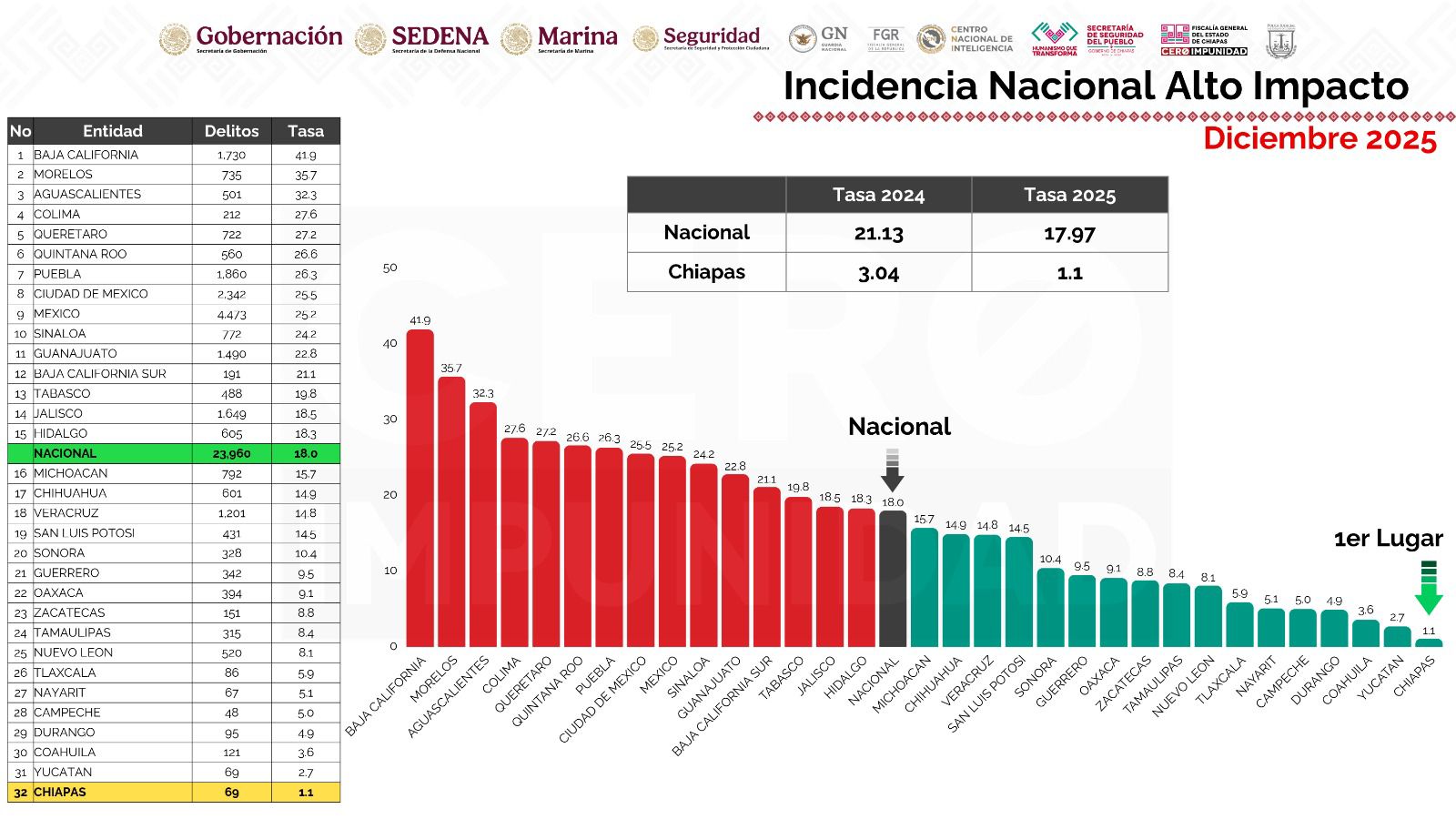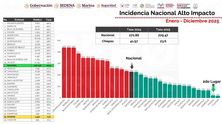 En el comparativo anual entre 2025 y 2024, precisó que Chiapas presentó una reducción del 43.8 por ciento en la incidencia de delitos de alto impacto, posicionándose en el segundo lugar nacional en disminución porcentual. “El estado tuvo un año altamente positivo en materia de seguridad”, acotó.