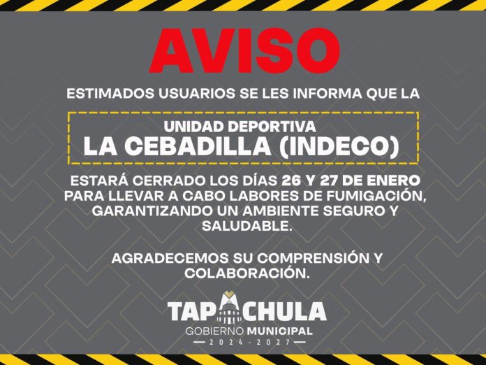 El Ayuntamiento de Tapachula informa a toda la población que la Unidad Deportiva La Cebadilla (INDECO) permanecerá cerrada los días 26 y 27 de enero, con motivo de la realización de labores de fumigación.
