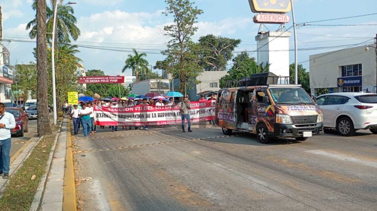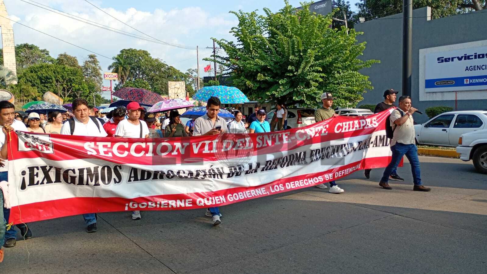 Tapachula, Chiapas 26 de Enero del 2026.- Este lunes 26 de enero, integrantes de la Coordinadora Regional Costa Grande, pertenecientes a la Sección VII del SNTE-CNTE, realizan una movilización en la ciudad de Tapachula para exigir al Gobierno Federal el cumplimiento de demandas históricas relacionadas con pensiones, jubilaciones y servicios de salud.