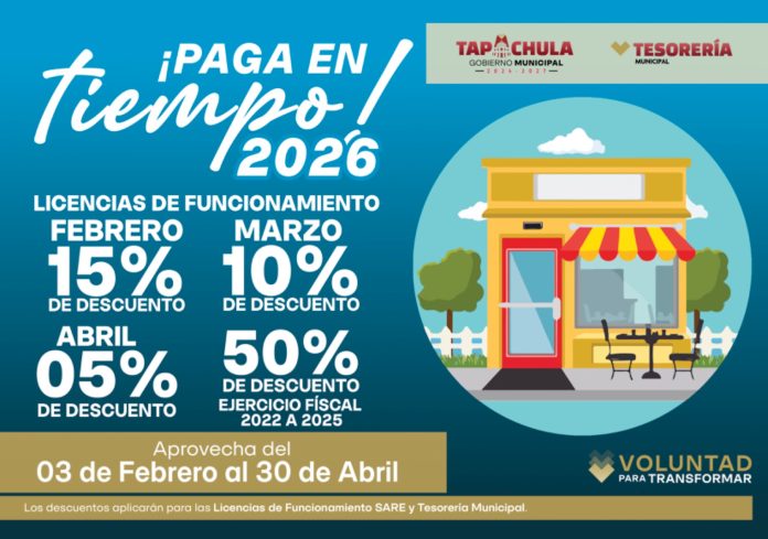 El Ayuntamiento de Tapachula a través de la Tesorería Municipal, invita a los contribuyentes a pagar en tiempo sus Licencias de Funcionamiento 2026 y aprovechar los descuentos vigentes.