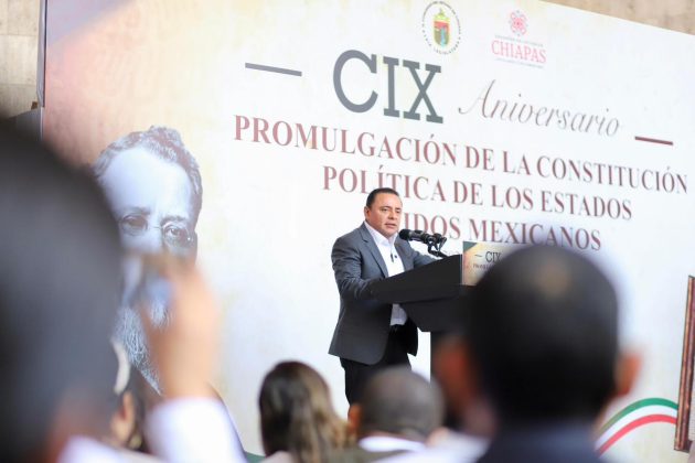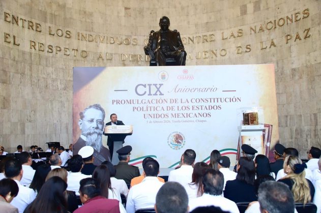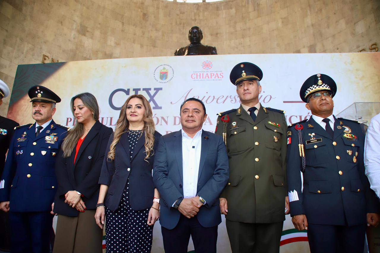 En el marco de la ceremonia cívica conmemorativa por el CIX aniversario de la promulgación de la Constitución Política de los Estados Unidos Mexicanos, encabezada en representación del gobernador Eduardo Ramírez Aguilar, por la secretaria general de Gobierno, Dulce María Rodríguez Ovando; el magistrado presidente del Poder Judicial del Estado de Chiapas, Juan Carlos Moreno Guillén, participó como orador oficial, destacando la vigencia histórica, jurídica y moral de nuestra Carta Magna.