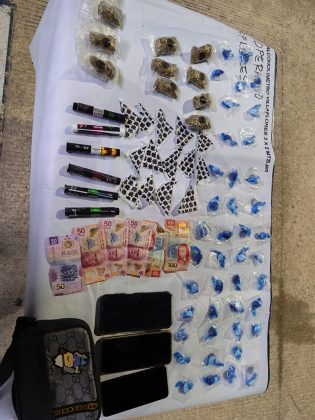 De acuerdo con los hechos, los elementos del orden, al estar realizando recorridos preventivos en la zona, tuvieron a la vista a los inculpados y al realizarles una inspección se les localizaron tres teléfonos celulares, dinero en efectivo, seis cigarros de marihuana, 10 bolsitas con marihuana, 42 bolsitas con y cocaína, 14 bolsitas con cristal y una mariconera.