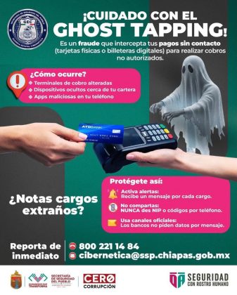 Tuxtla Gutiérrez, Chiapas; 15 de febrero de 2026.- La Secretaría de Seguridad del Pueblo (SSP), que encabeza Óscar Alberto Aparicio Avendaño, a través de la Guardia Estatal Cibernética, alerta a la ciudadanía sobre una nueva modalidad de fraude denominado “Ghost Tapping”, que permite realizar cargos no autorizados en tarjetas bancarias.