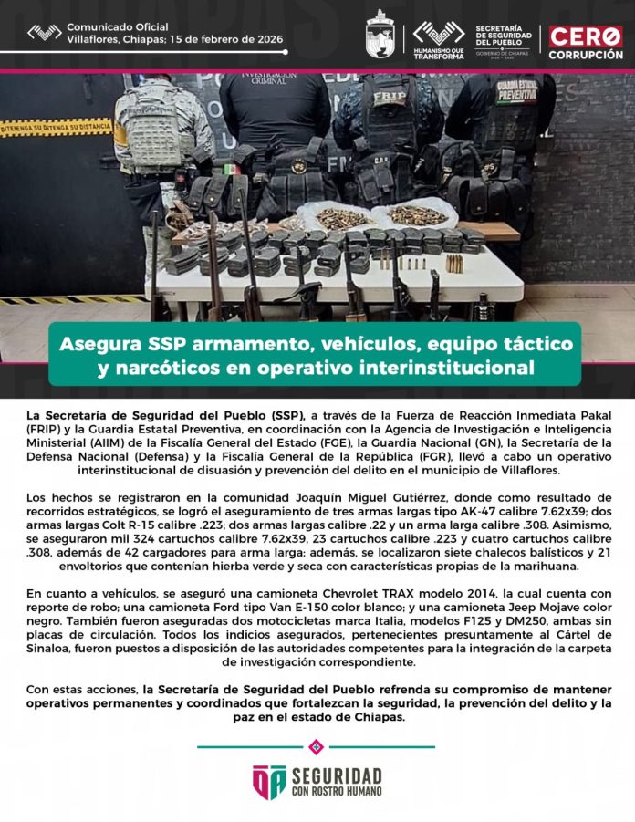 Villaflores, Chiapas; 15 de febrero de 2026.- La Secretaría de Seguridad del Pueblo (SSP), a través de la Fuerza de Reacción Inmediata Pakal (FRIP) y la Guardia Estatal Preventiva, en coordinación con la Agencia de Investigación e Inteligencia Ministerial (AIIM) de la Fiscalía General del Estado (FGE), la Guardia Nacional (GN), la Secretaría de la Defensa Nacional (Defensa) y la Fiscalía General de la República (FGR), llevó a cabo un operativo interinstitucional de disuasión y prevención del delito en el municipio de Villaflores.