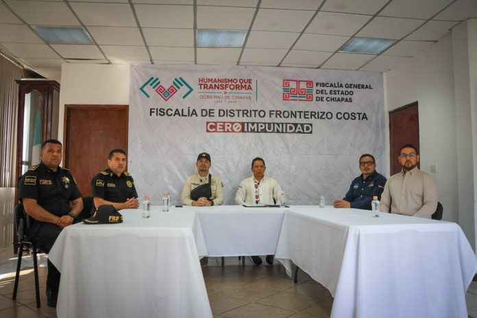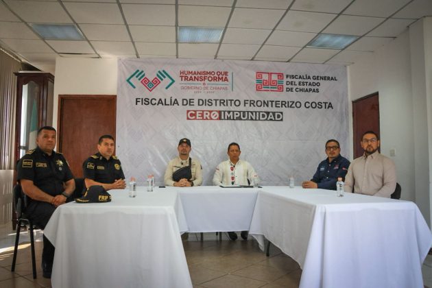 Tapachula, Chiapas; 18 de febrero de 2026.- Por acuerdo de la Mesa de Paz que encabeza el gobernador del estado, Eduardo Ramírez Aguilar, el secretario de Seguridad del Pueblo, Óscar Alberto Aparicio Avendaño, sostuvo una reunión de trabajo en la Fiscalía de Distrito Fronterizo Costa, con el fiscal general del estado, Jorge Luis Llaven Abarca, para coordinar e instalar de manera inmediata mesas de atención y denuncias para prevenir el delito de extorsión que atenta contra el patrimonio y seguridad de la población local, así como de visitantes de Guatemala, El Salvador y Honduras.