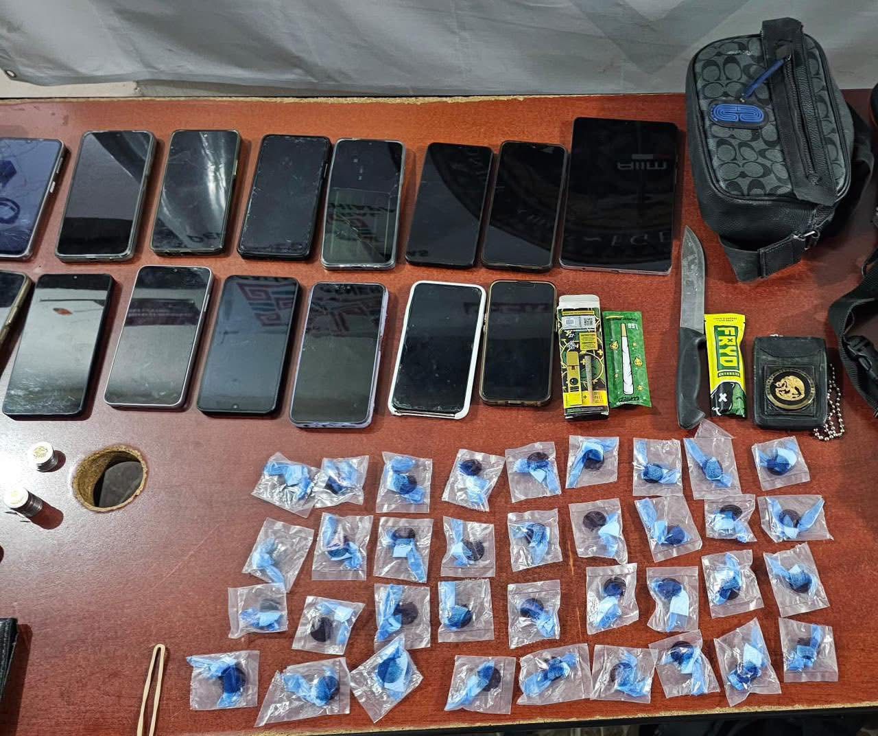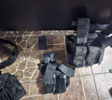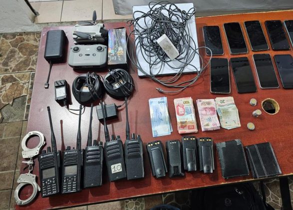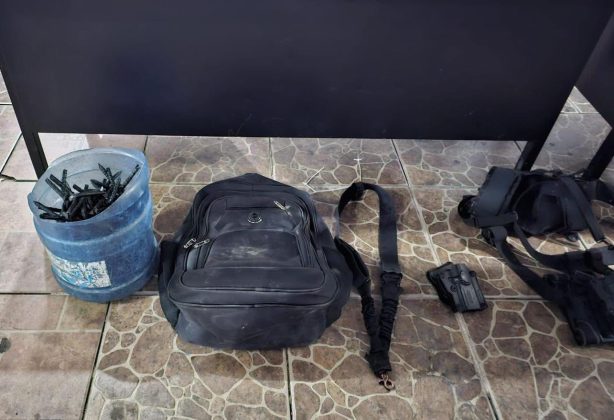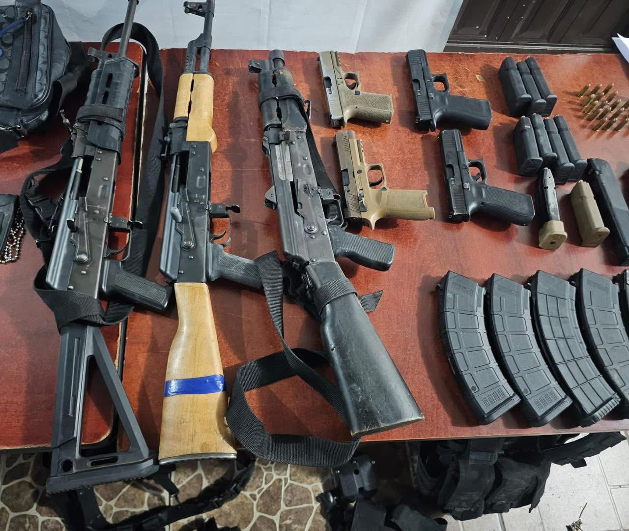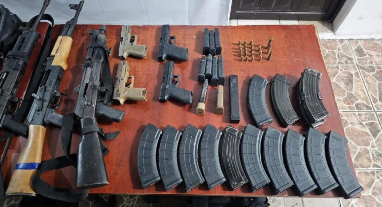 Asegurándose tres armas largas calibre 7.62×39 mm con cargadores abastecidos y cuatro armas cortas calibre 9 mm también con cargadores abastecidos; 322 cartuchos calibre 7.62×39 mm; un chaleco balístico y siete accesorios balísticos; 10 cargadores para arma corta y 13 cargadores para arma larga; 36 bolsas de plástico con sustancia con características propias de la droga conocida como cocaína; dinero en efectivo; 68 artefactos metálicos conocidos como “ponchallantas”; cinco radios de comunicación; un candado de mano; 14 teléfonos celulares; un dron; un arma blanca (cuchillo) y un porta placa color negro.