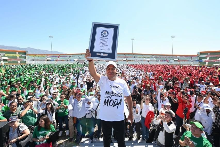 El gobernador Eduardo Ramírez Aguilar participó junto al pueblo de Chiapas en el rompimiento del Récord Guinness: Imagen Humana de Camiseta de Fútbol Más Grande, primer evento oficial rumbo a la Copa Mundial de la FIFA 2026 en México, el cual fue presenciado de manera virtual por la presidenta de la República, Claudia Sheinbaum Pardo, quien felicitó a todas las personas que formaron parte de esta iniciativa.
