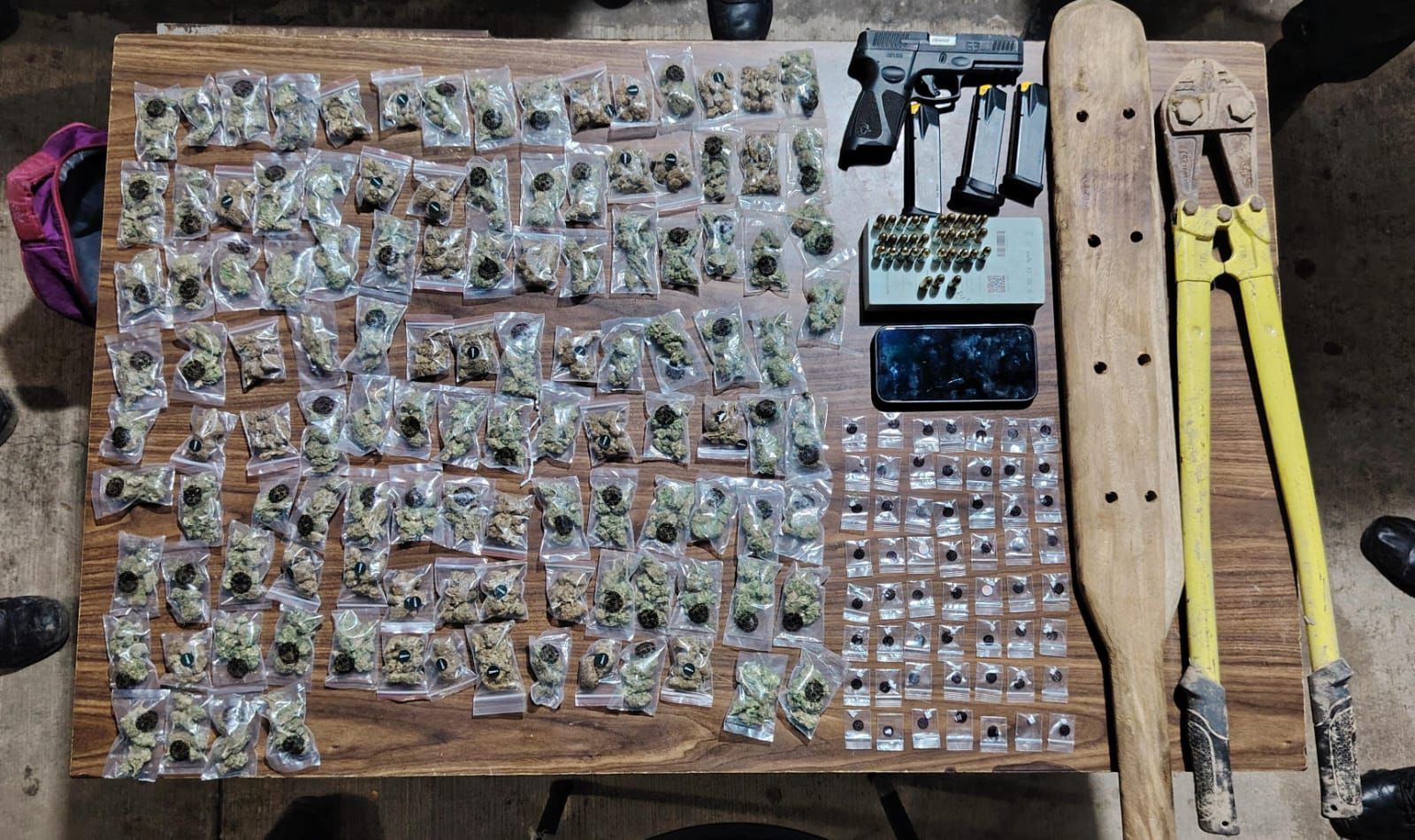 En el vehículo fueron localizados un arma de fuego tipo escuadra marca Taurus G3, tres cargadores, 33 cartuchos útiles calibre 9 mm, diversas dosis de hierba con características de marihuana y sustancia granulada con características de droga conocida como “piedra”, además de un teléfono celular, herramientas y libretas con anotaciones.