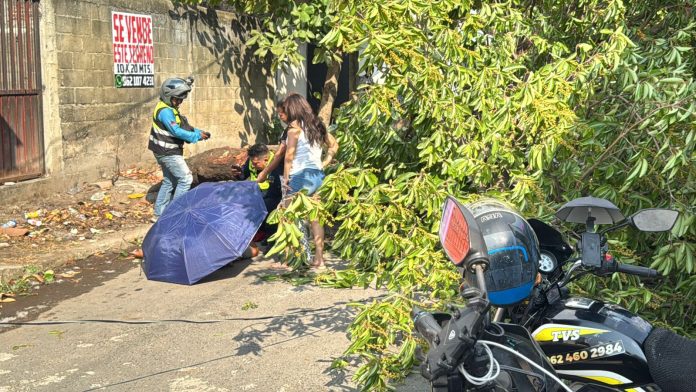 Tapachula, Chiapas; martes 17 de marzo de 2026.— Un motociclista resultó lesionado luego de que un árbol colapsara a causa de los fuertes vientos en la colonia La Joya, al sur de la ciudad.