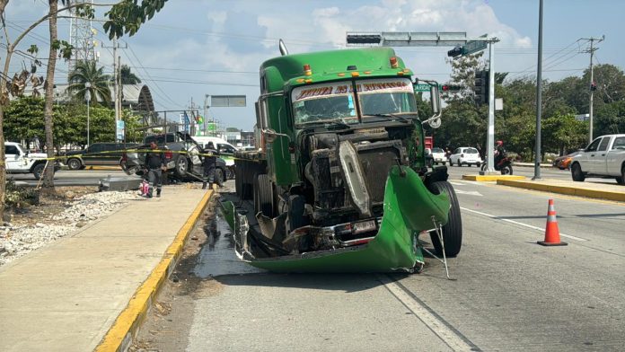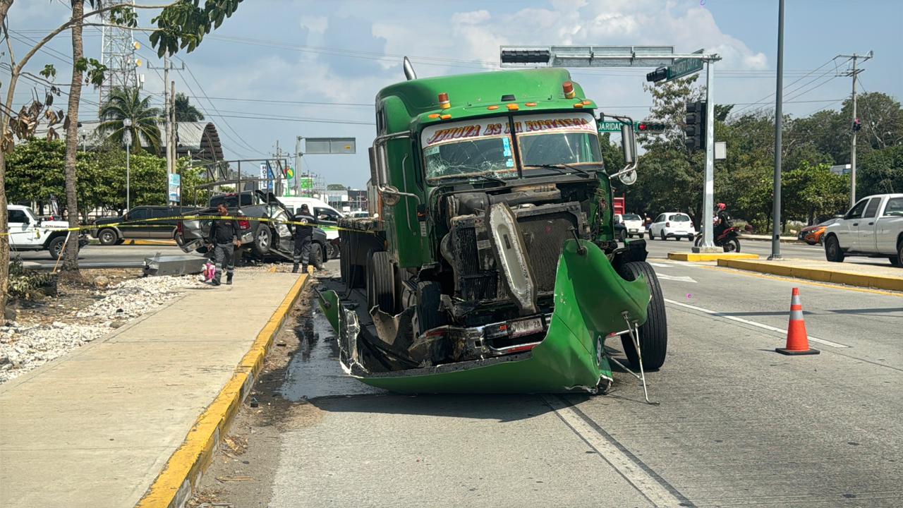 En ese momento, un tráiler de plataforma con cabina verde, que circulaba en sentido opuesto, no logró detenerse, impactando de frente a la unidad particular. Tras el choque, la camioneta fue proyectada varios metros, causando daños a la vía pública.
