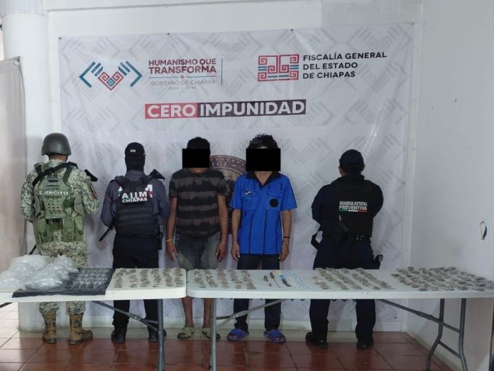 Como resultado, los elementos del orden detuvieron a Ubistano “N” y Carlos “N”, como presuntos responsables del delito contra la salud, asegurándoles 120 bolsitas con marihuana, 40 bolsitas con cristal, 175 pipas de cristal y una motocicleta.