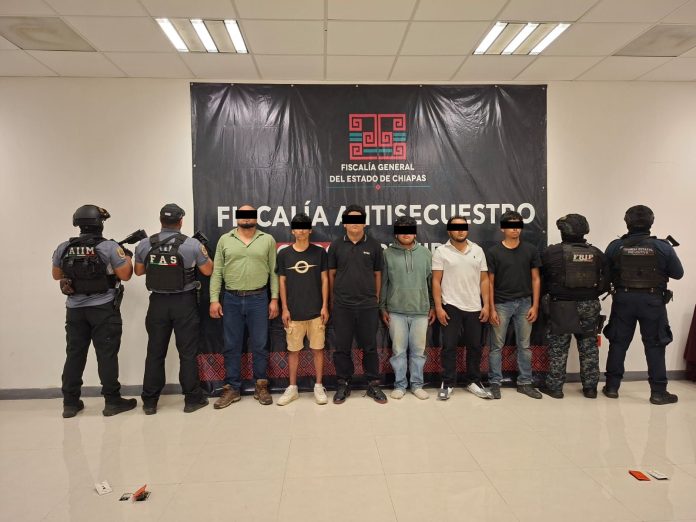 La Fiscalía General del Estado de Chiapas, en coordinación con la Fiscalía General del Estado de Tabasco, SEDENA, la SSPC de Tabasco, la SSP y la FGR, detuvieron en flagrancia a Adriel “N”, originario de Tabasco, así como a Christopher “N”, Antonio “N”, John “N”, Leonel “N” y José “N”, estos últimos originarios de Chiapas, como presuntos responsables del delito de secuestro agravado, cometido en perjuicio de una persona del sexo masculino, de identidad reservada, por hechos ocurridos en el municipio de Mezcalapa.