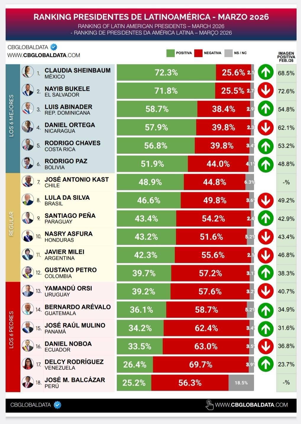 * Marzo 2026: La Presidenta Claudia Sheinbaum arranca el primer trimestre del año encabezando el ranking de presidentes latinoamericanos con una aprobación del 72.3%, seguida de Nayib Bukele de El Salvador y Luis Abinader de República Dominicana.