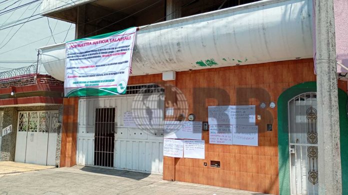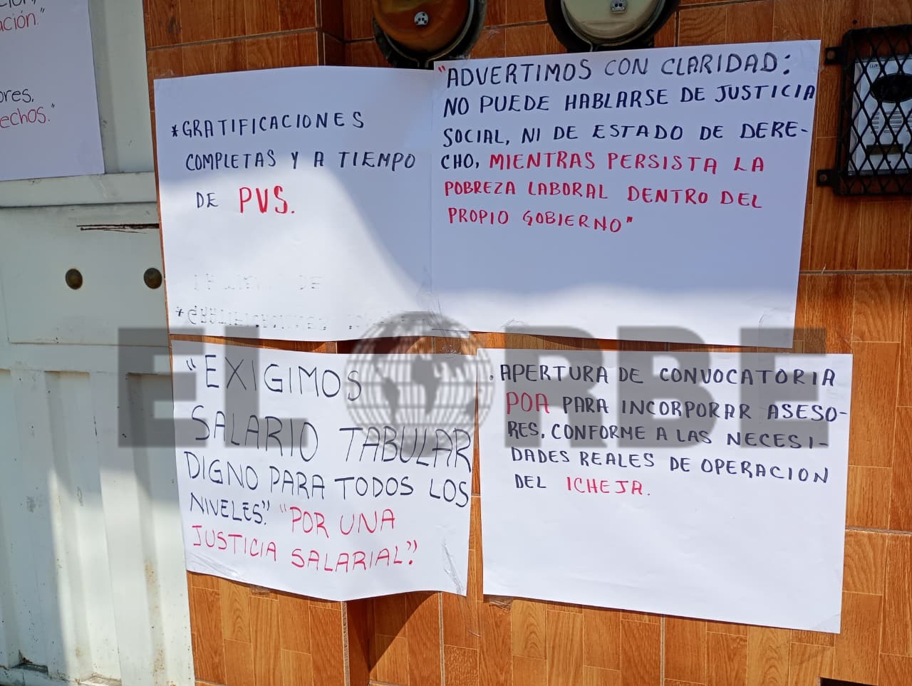 Tapachula, Chiapas; 8 de abril de 2026.- Trabajadores del Instituto Chiapaneco de Educación para Jóvenes y Adultos se manifestaron este miércoles en las oficinas centrales ubicadas en la colonia Centro, donde colocaron lonas y cartulinas para exigir mejores condiciones laborales y operativas.