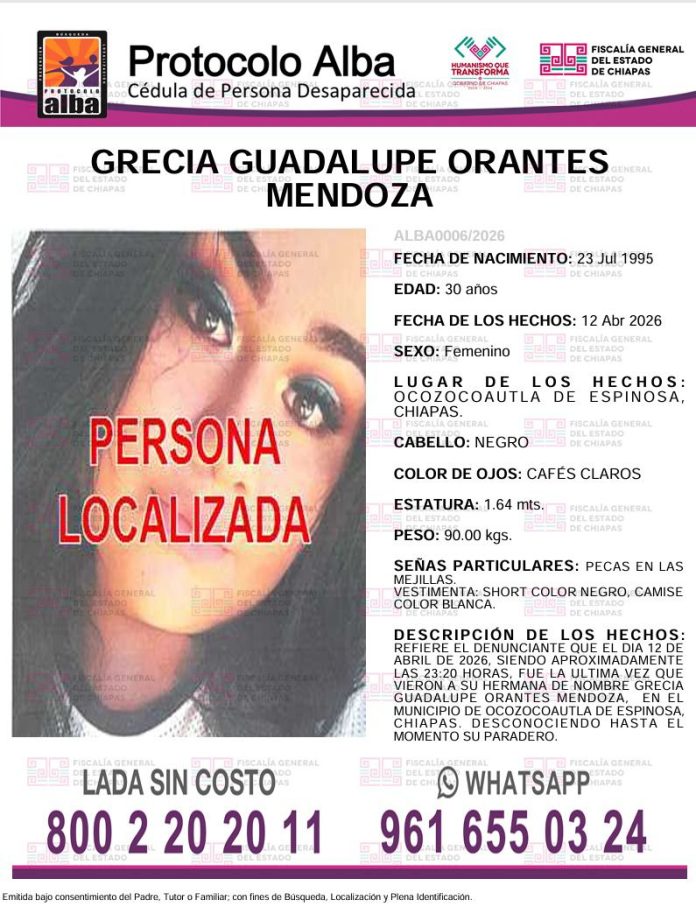 La Fiscalía General del Estado informa que la persona reportada como desaparecida, de nombre Grecia Guadalupe “N”, ha sido localizada a salvo y se encuentra siendo atendida por un grupo multidisciplinario de acuerdo al protocolo establecido.