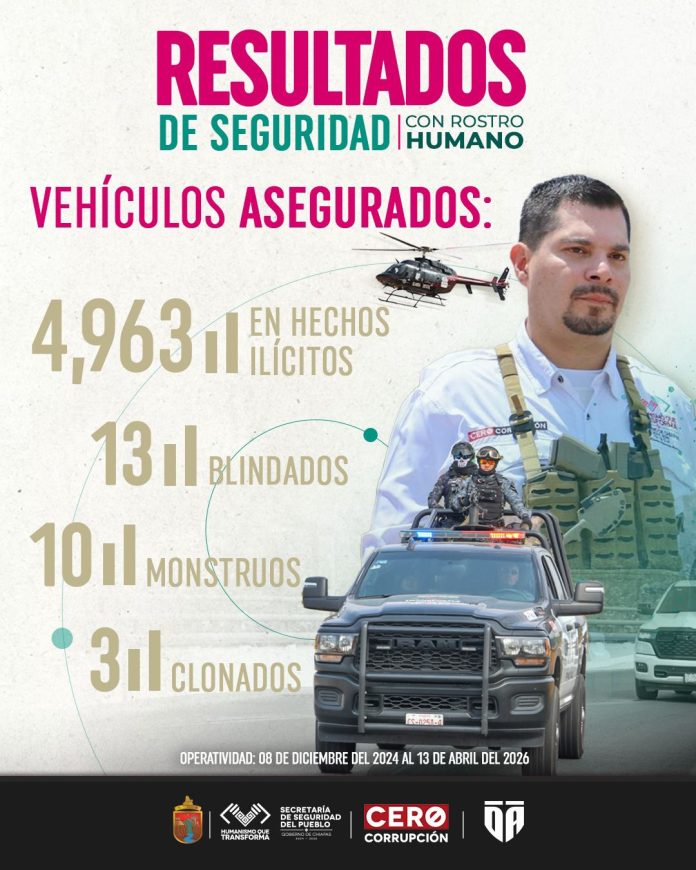 Chiapas; 16 de abril de 2026.- En la Nueva ERA de seguridad, Chiapas continúa avanzando firme en el camino de la paz con resultados reales y contundentes; como parte de esta estrategia que impulsa el gobernador del estado, Eduardo Ramírez Aguilar, la Secretaría de Seguridad del Pueblo (SSP), que encabeza Óscar Alberto Aparicio Avendaño, en coordinación con autoridades de los tres niveles de gobierno, se ha logrado el aseguramiento de cuatro mil 963 vehículos en hechos ilícitos.